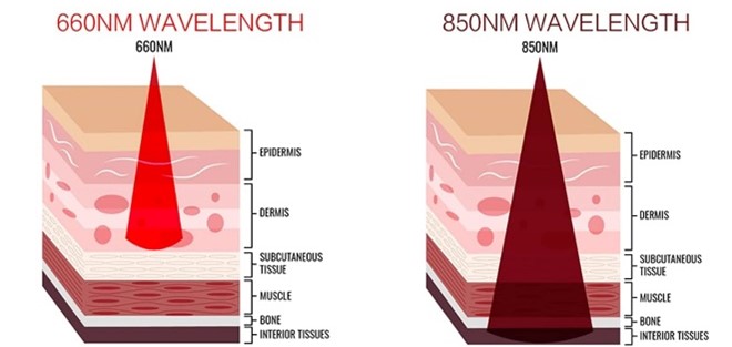 These wavelengths penetrate tissue to different depths. They have an effect on animal tissue through a process called Photobiomodulation (PBM), as does laser therapy.