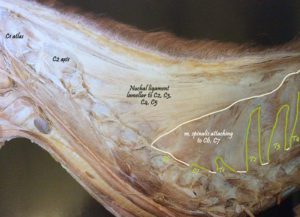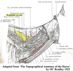 I have also altered this image, in order to show M. spinalis cervicis more clearly. This is Fig 2.16 from Colour Atlas of Veterinary Anatomy Vol 2, The Horse, R Ashdown and S Done. Spinalis cervicis is within the bounded area and it’s possible to see how it overlies the lamellar part of the nuchal ligament, lamellar portion. (added 23 Dec 2016)