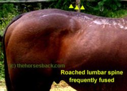 Lumbar 1A long-term rotated lumbar spine will usually have some fusion between the vertebrae, and/or overriding dorsal processes (the part of the vertebrae you can feel). Fused areas are painful for the horse while they’re happening, and OK once the fusion is complete. But if fusion cracks, it can once more be extremely painful. Many horses compete just fine with some fusion, but if it’s severe, there’ll be problems with flexion, both vertical and lateral.